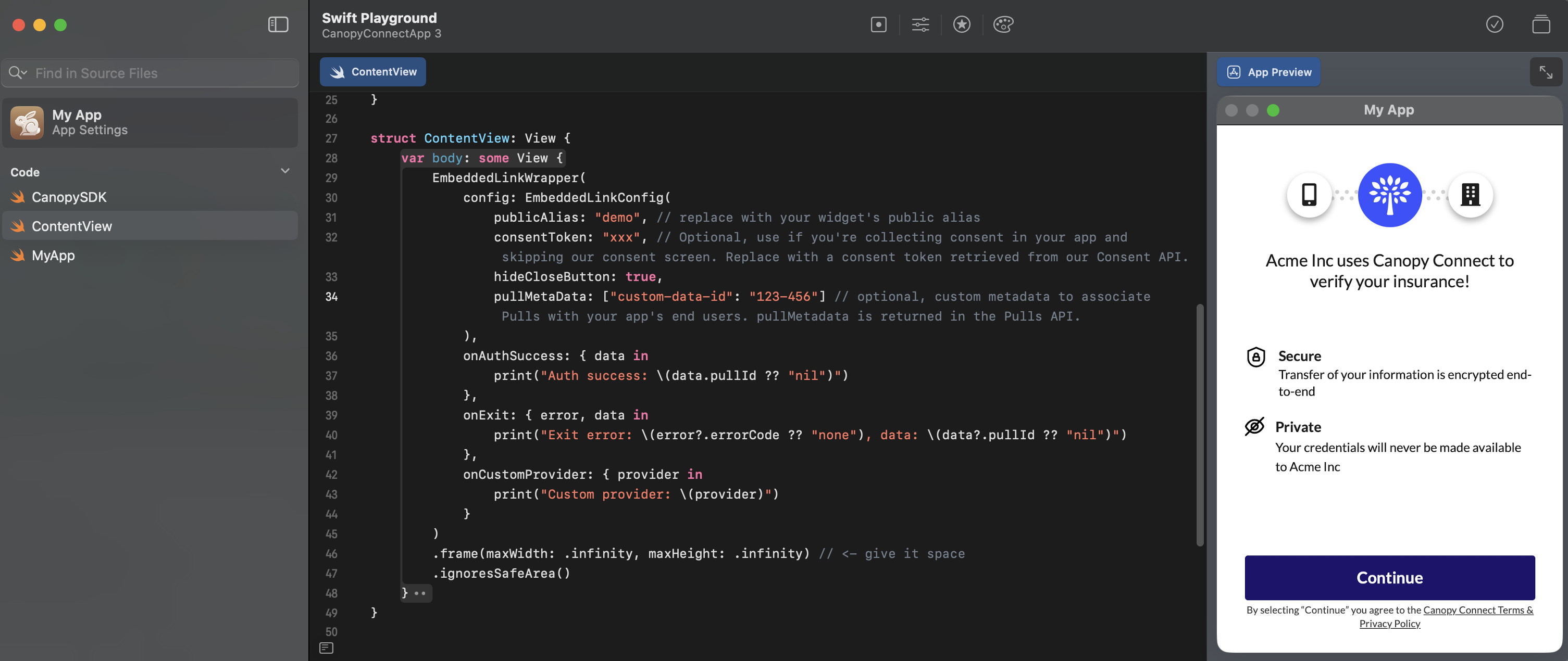 - In the ContentView file, locate the EmbeddedLinkConfig setup on line 30.